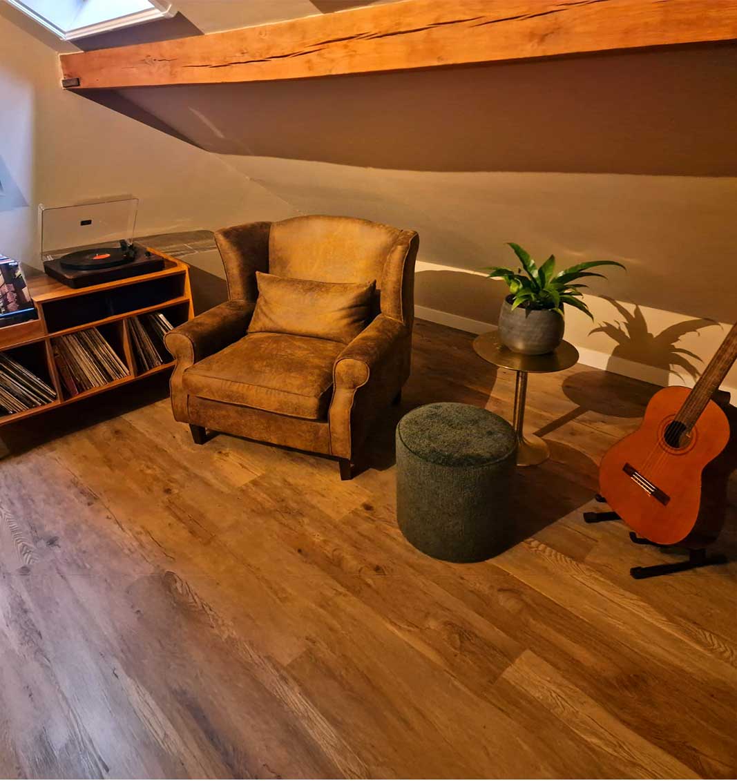De kamer ademt een muzikale sfeer met een platenspeler en een selectie vinylplaten, waardoor je kunt genieten van een intieme en sfeervolle ambiance. Perfect voor muziekliefhebbers die willen ontspannen in stijl.