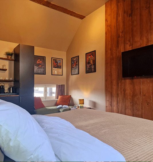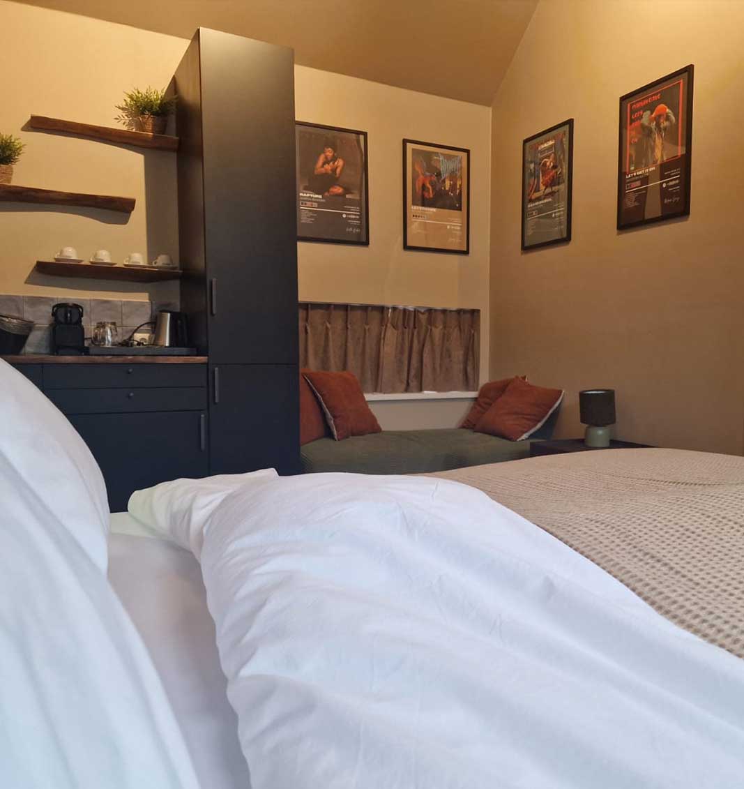 In de Muziekkamer komt muziek en comfort samen. Geniet van een heerlijke nachtrust in het comfortabele 2-persoonsbed en ontspan in je eigen luxe badkamer, compleet met een badje, handdoeken, en verzorgingsproducten.